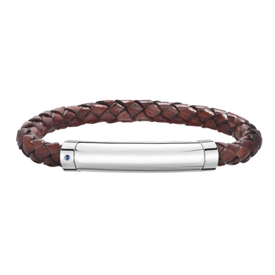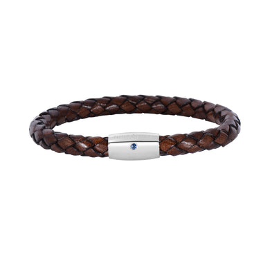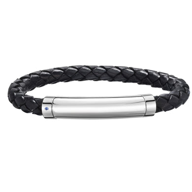 Sterling Silver Men's Leather Bar Bracelet With Blue Saphire