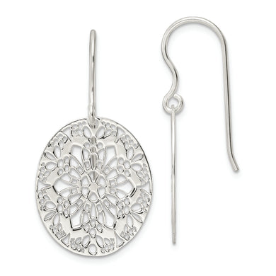 Sterling Silver Polished Floral Oval Dangle Earrings