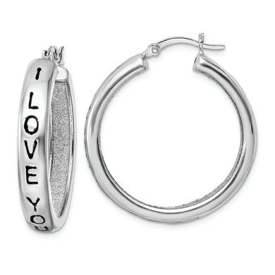 Sterling Silver Rhodium-plated Fabric Glitter I Love You Hoop Earrings