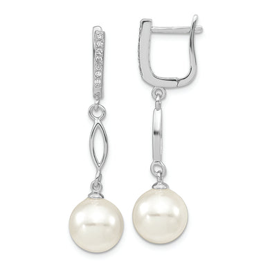 Sterling Silver Majestik Rh-pl 10-11mm Wht Imit. Shell Pearl CZ Hoop Earrin