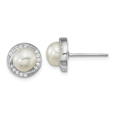 Sterling Silver Rho-plated CZ 6-7mm White Button FWC Pearl Post Earrings