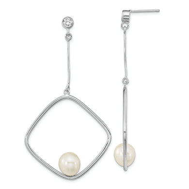 Sterling Silver Rhod-plated 7-8mm White Rice FWC Pearl CZ Dangle Earrings
