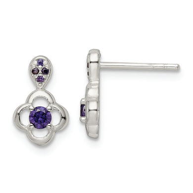Sterling Silver Polished Purple CZ Flower Post Dangle Earrings