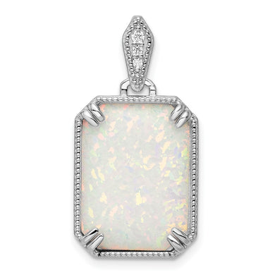 Sterling Silver RH-plated White Created Opal & CZ Beaded Border Pendant