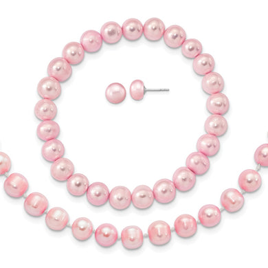Sterling Silver Rh-p 7-8mm Pink FWC Pearl Earring Bracelet Necklace Set