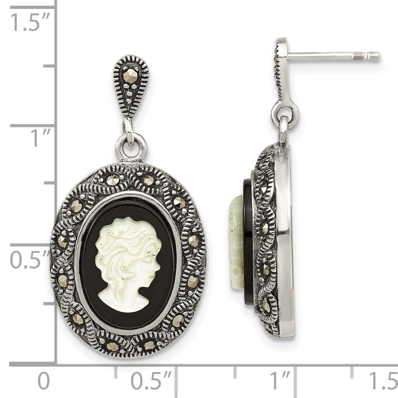 Sterling Silver Antiqued Black Agate Marcasite & MOP Cameo Post Dangle Earr