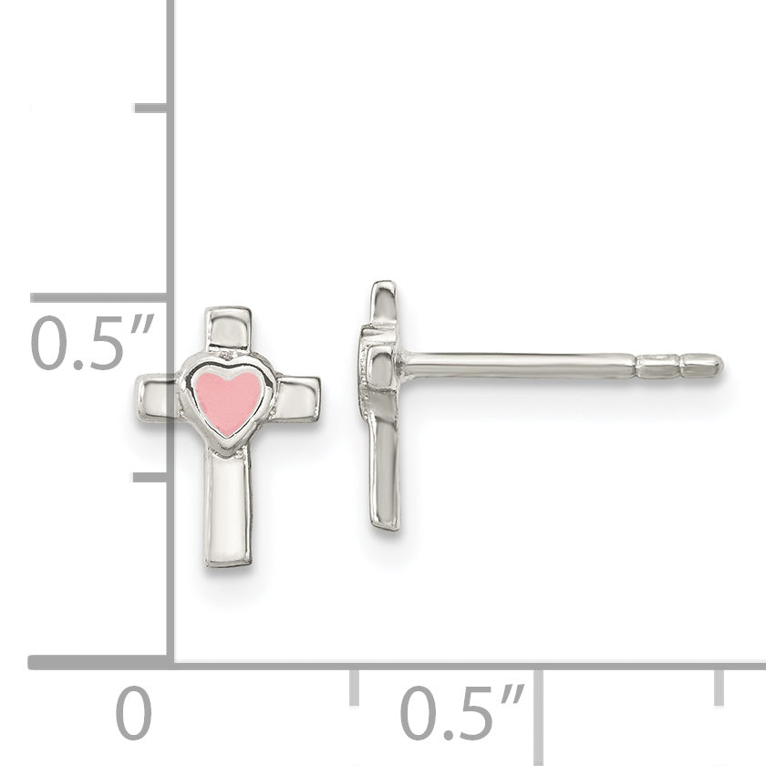 Sterling Silver Cross Pink Enamel Heart Post Earrings