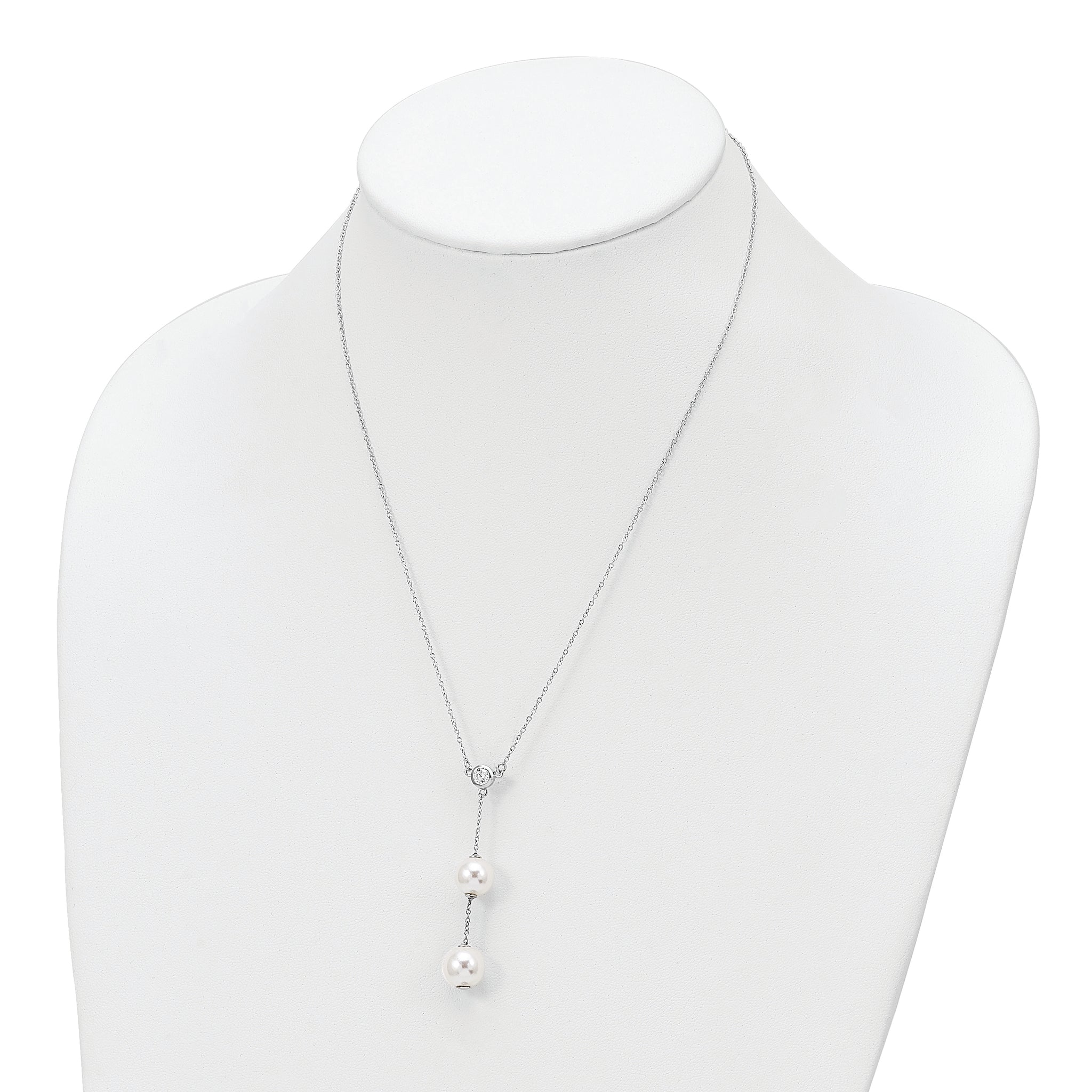 Majestic Sterling Silver Rhodium-plated 10-11mm White Imitation Shell Pearl CZ Y-Drop Spring Ring Clasp 18 inch Necklace