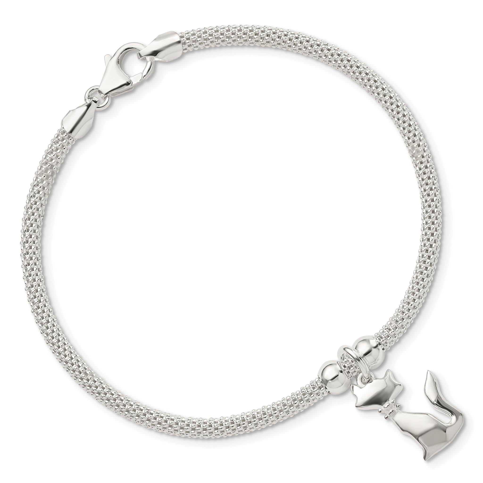 Sterling Silver Polished CZ Cat Charm Bracelet