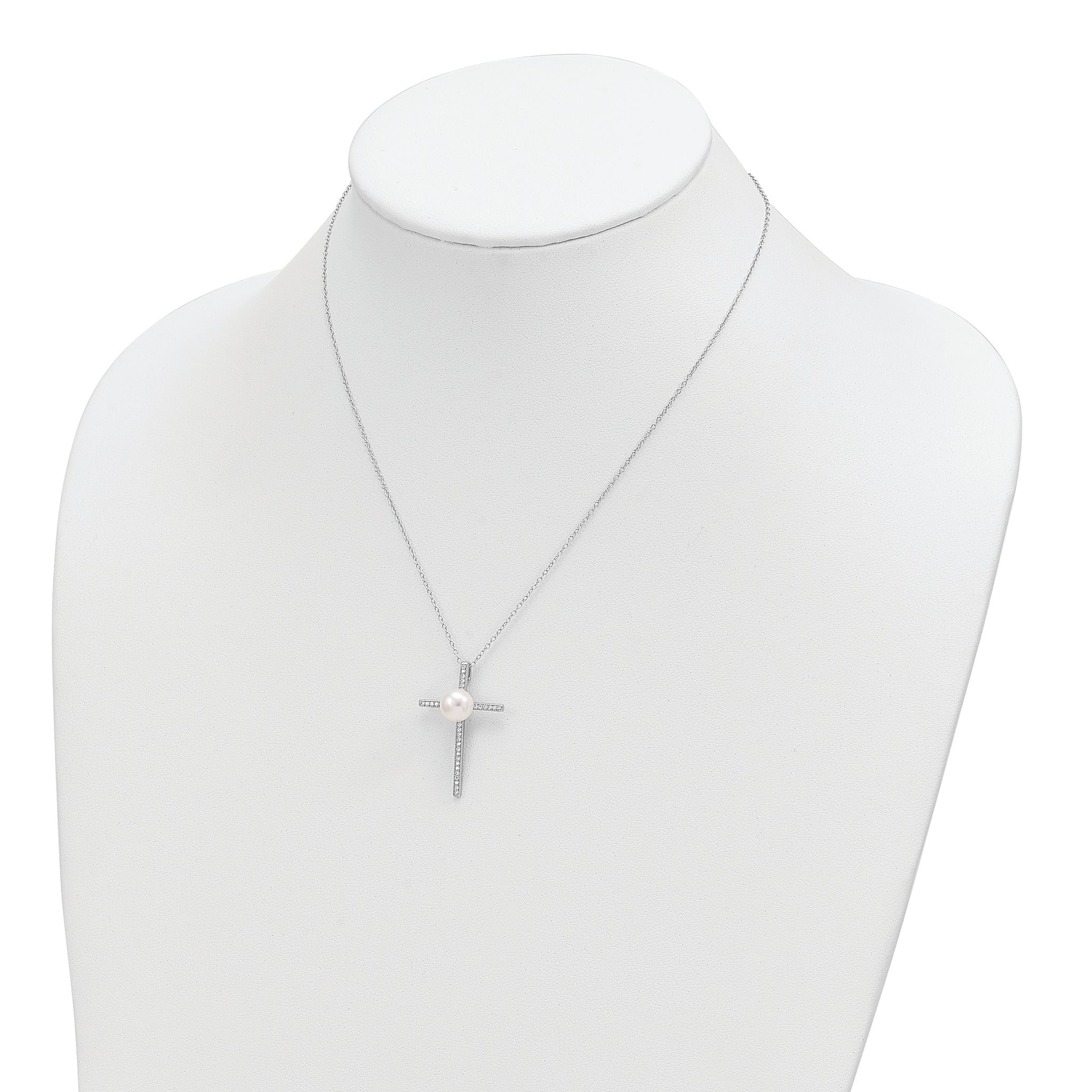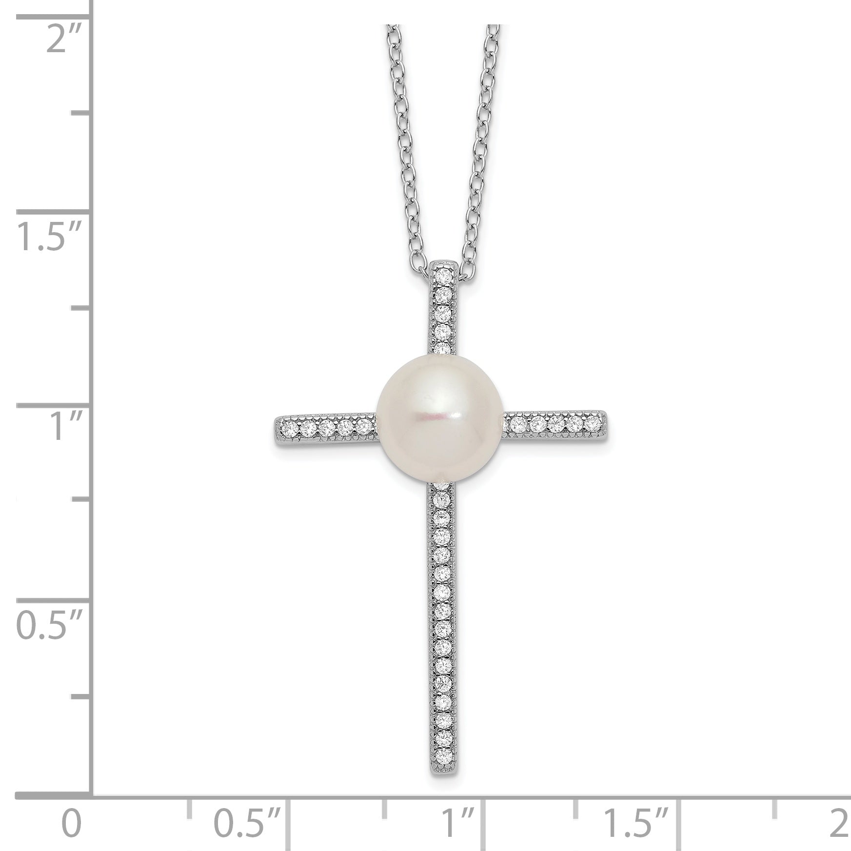 Sterling Silver Rhodium-plated 8-9mm Button FWC Pearl CZ Cross Necklace