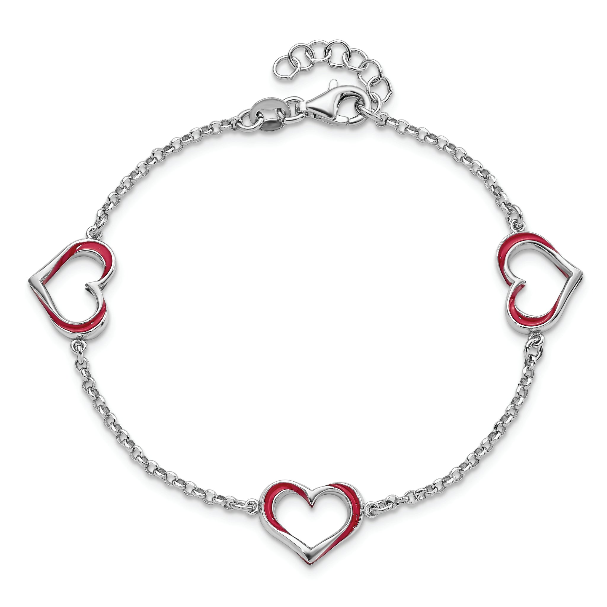 Sterling Silver Rhodium-plated Red Enamel 3-Heart w/.5 in Ext Bracelet